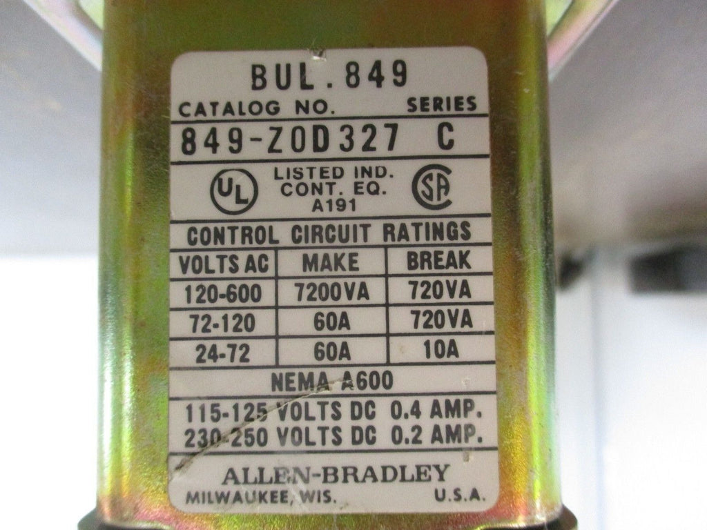 Allen-Bradley Timing Relay 849-Z0D327 Ser. C 120V Coil Used_x000D_ Condition: UsedCoil Voltage: 120 VMPN: 849-Z0D327Brand: Allen-Bradley Allen-Bradley Timing Relay 849-Z0D327 Ser. C 120V Coil Used Allen-Bradley Timing Relay Part #: 849-Z0D327 Ser. C 120 V Coil Used Loc: 12K5-4 Allen-Bradley Timing Relay Part #: 849-Z0D327 Ser. C 120 V Coil Uséd Loc: 12K5-4