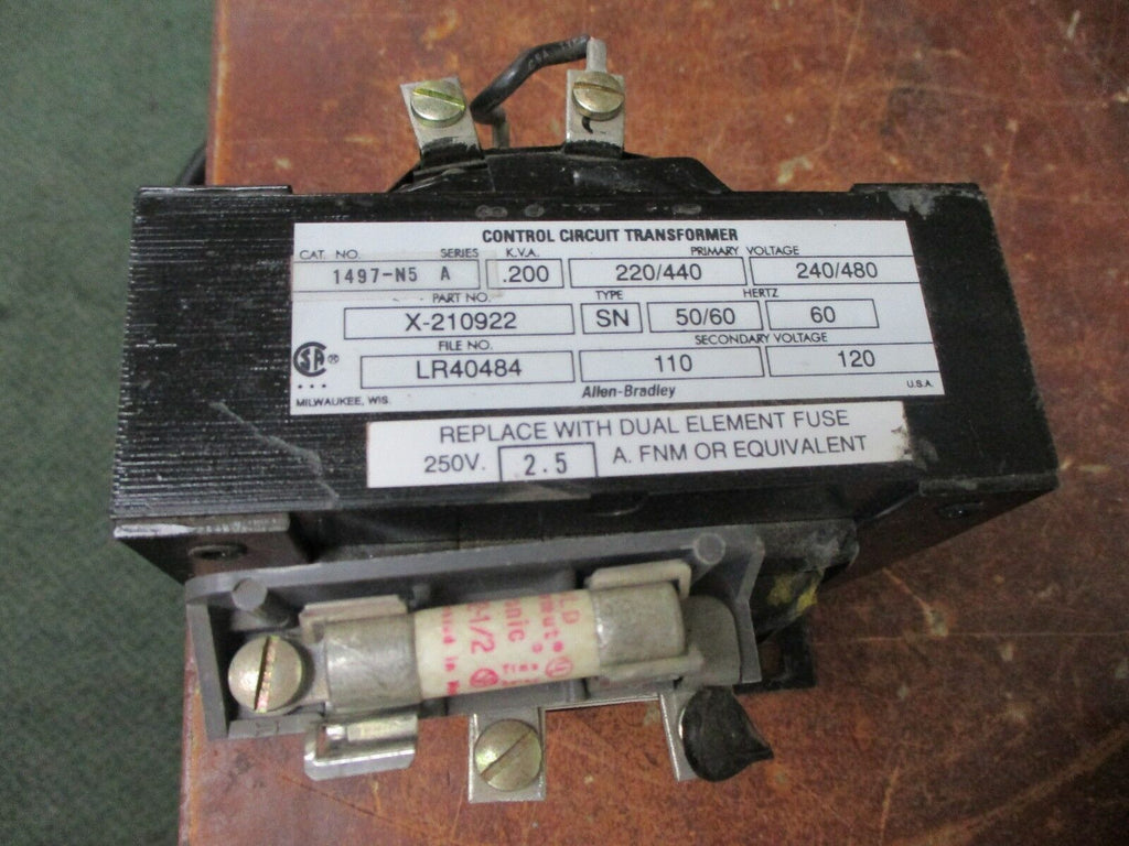 Allen-Bradley Type SN Control Transformer 1497-N5-A 0.200KVA Pri: 240/480V Used Condition: UsedMPN: 1497-N5-ABrand: Allen-Bradley Allen-Bradley Type SN Control Transformer 1497-N5-A 0.200KVA Pri: 240/480V Used Allen-Bradley Type SN Control Transformer Part # 1497-N5-A 0.200 KVA Pri: 240/480V Sec: 120V 60HzUsedLOC 17C3-16 Allen-Bradley Type SN Control Transformer Part # 1497-N5-A 0.200 KVA Pri: 240/480V Sec: 120V 60Hz Uséd LOC 17C3-16
