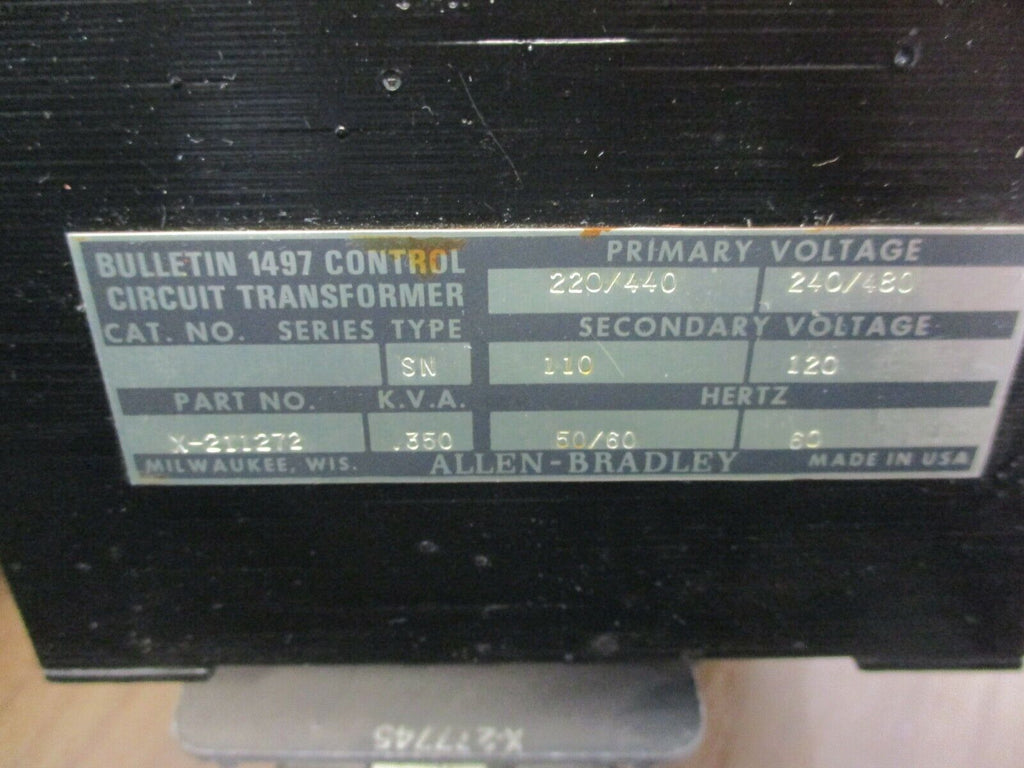 Allen-Bradley Type SN Control Transformer X-211272 0.350kVA Pri: 240/480V Used Condition: UsedNominal Power Rating: 0.350 kVAMPN: X-211272Brand: Allen-BradleyVoltage Rating: 240/480 V Allen-Bradley Type SN Control Transformer X-211272 0.350kVA Pri: 240/480V Used Allen-Bradley Type SN Control Transformer Part #: X-211272 0.350kVA Pri: 240/480V Sec: 120VUsedLOC 25A2-24 Allen-Bradley Type SN Control Transformer Part #: X-211272 0.350kVA Pri: 240/480V Sec: 120V Uséd LOC 25A2-24