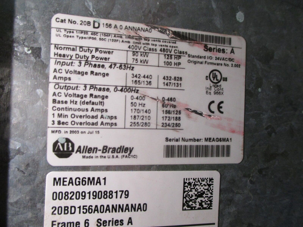 Allen-Bradley VTAC 9 / PowerFlex 700 AC Drive Part #: 20BD156A0ANNANA0 125 HP 3Ph Input: AC Voltage Range: 432-528 147/131 A 47-63 Hz Output: AC Voltage Range: 0-460 0-400 Hz Base hz (default): 60 Hz Continuous Amps: 156/125 1 Min Overload Amps: 172/188 3 Sec Overload Amps: 234/250 *No Keypad* *No Top Cover* *Bent Foot* Used Loc: AB11-4577 / AB38N2