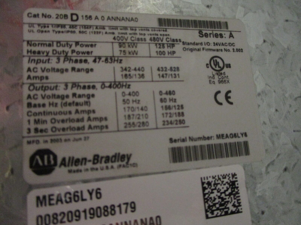 Allen-Bradley VTAC 9 / PowerFlex 700 AC Drive Part #: 20BD156A0ANNANA0 9VT401-156FNANA 125 HP 3Ph Input: AC Voltage Range: 432-528 147/131 A 47-63 Hz Output: AC Voltage Range: 0-460 0-400 Hz Base hz (default): 60 Hz Continuous Amps: 156/125 1 Min Overload Amps: 172/188 3 Sec Overload Amps: 234/250 *Bent Cover* Used Loc: AB11-4581 / AB37N2