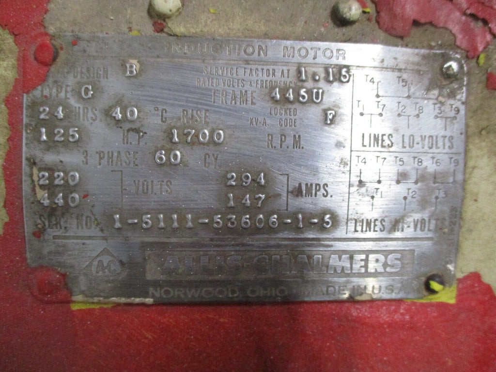 Allis AC Motor 125HP 1800RPM 220/440V 294/147A 60Hz 3Ph 445U Frame Used