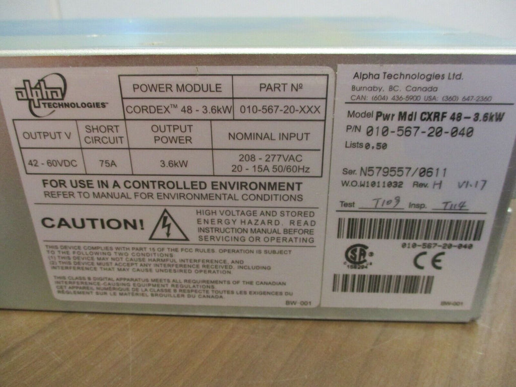Alpha Technologies Codex RectifierPart #: 010-567-20-040 Model: Pwr Mdl CXRF 48-3.6kWRev. H Input:208-277VAC20-15A50-60HzOutput:42-60VDC3.6kWUsedLOC AB12E2-1- Part #: 010-567-20-040