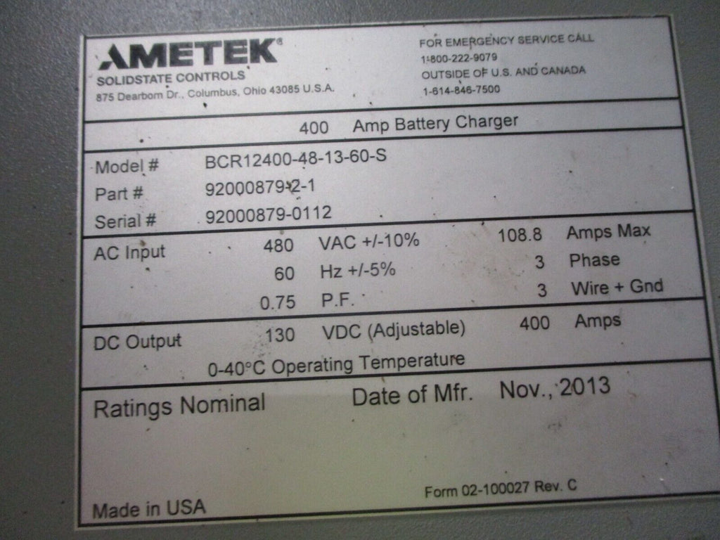 Ametek Battery Charger BCR12400-48-13-60-S 400A Output: 130VDC 400A Used