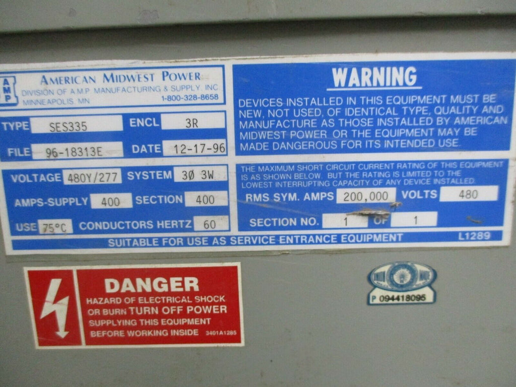 AMP 3R Enclosed Fuse Pullout Switch SES335 400A 480Y/277V 60Hz 3Ph 3W Used