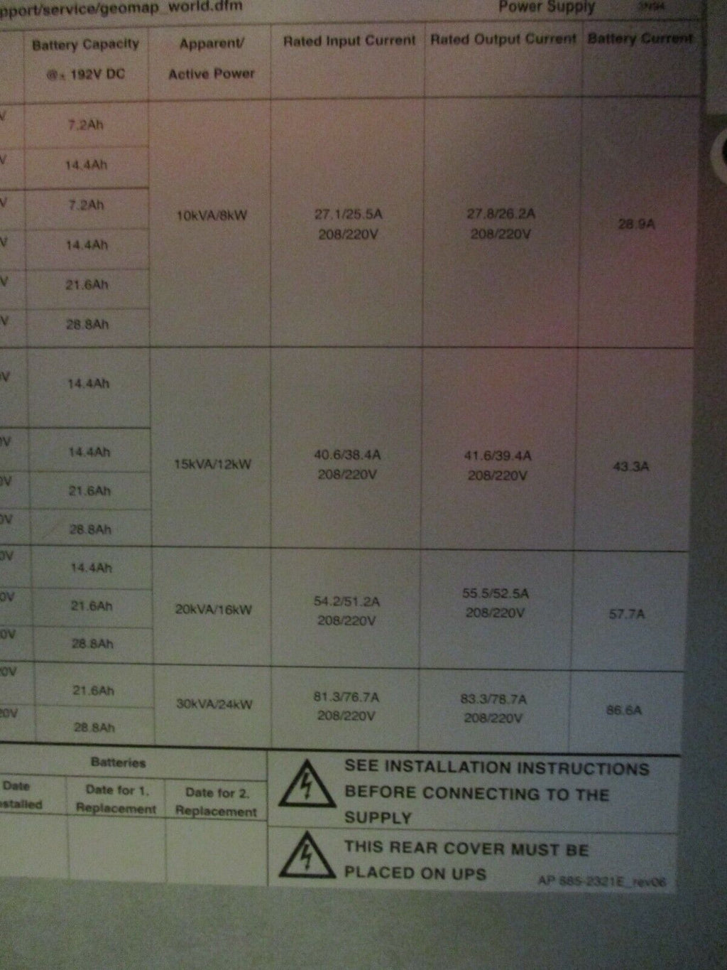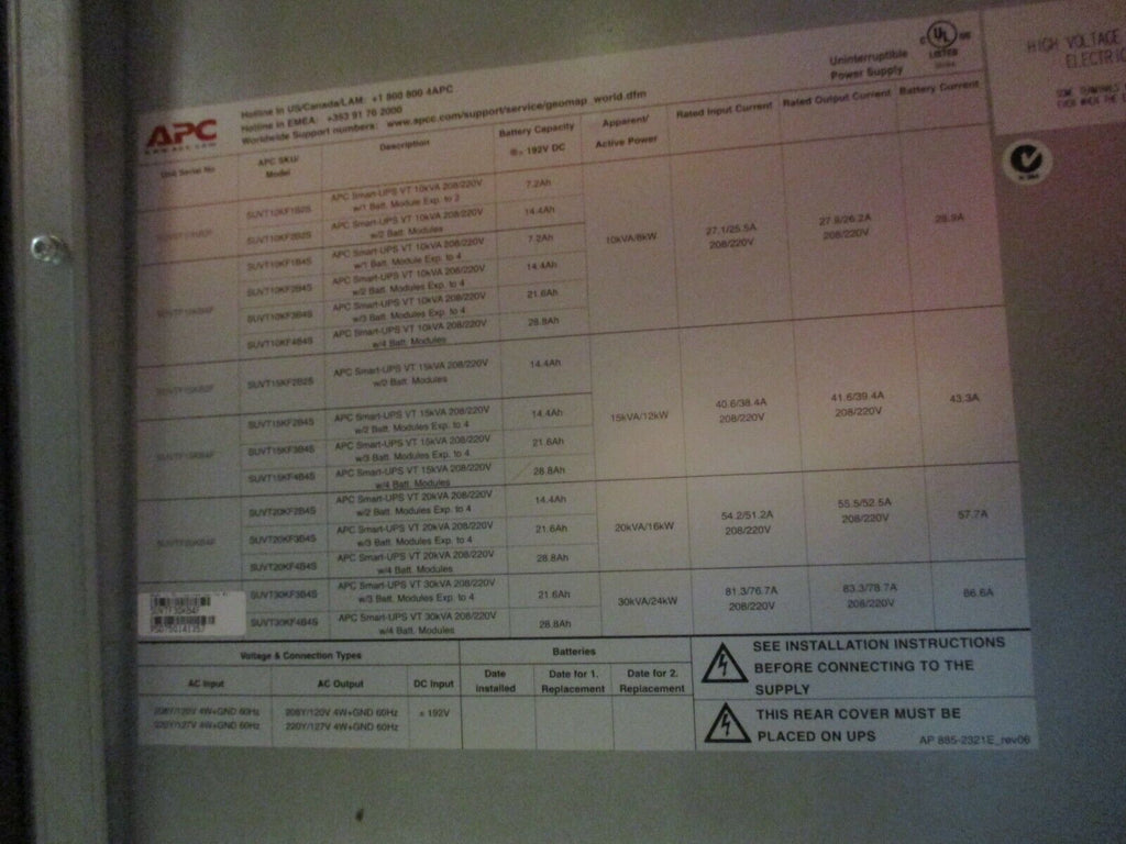 APC Smart UPS SUVT30KF3B4S 21.6Ah 30kVA 24kW 208/220V 3 Batteries Used