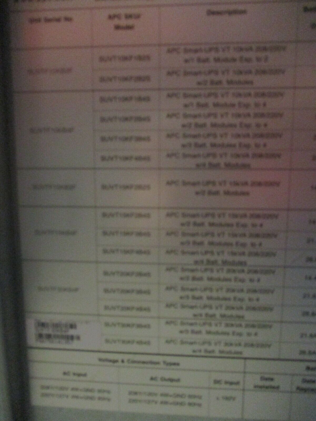 APC Smart UPS SUVT30KF3B4S 21.6Ah 30kVA 24kW 208/220V 3 Batteries Used Condition: UsedNominal Capacity: 21.6 AhMPN: SUVT30KF3B4SOutput Voltage Rating (AC): 208 VNominal Power Rating: 24 kWBrand: APCMounting Style: Stand Alone APC Smart UPS SUVT30KF3B4S 21.6Ah 30kVA 24kW 208/220V 3 Batteries Used APC Smart UPS Part #: SUVT30KF3B4S 21.6Ah 30kVA 24kW 208/220V 3 Battery ModulesBattery MFD: 2016UsedWeight: 1250 lbs.LOC AB11-3491 APC Smart UPS Part #: SUVT30KF3B4S 21.6Ah 30kVA 24kW 208/220V 3 Battery Modules Battery MFD: 2016 Uséd Weight: 1250 lbs. LOC AB11-3491