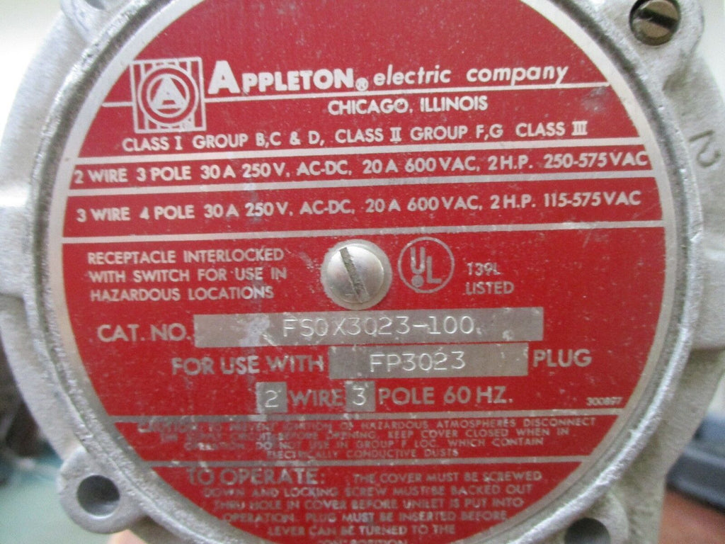 Appleton Explosion Proof Receptacle Interlocked w/ Switch FS0X3023-100 2W 3P Condition: UsedMPN: FS0X3023-100Brand: Appleton Electric Appleton Explosion Proof Receptacle Interlocked w/ Switch FS0X3023-100 2W 3P Appleton Explosion Proof Receptacle Interlocked w/ Switch Part # FS0X3023-100 2W 3P20/30A 600/250V60HzUsed LOC 18J2-3 Appleton Explosion Proof Receptacle Interlocked w/ Switch Part # FS0X3023-100 2W 3P 20/30A 600/250V 60Hz Uséd LOC 18J2-3