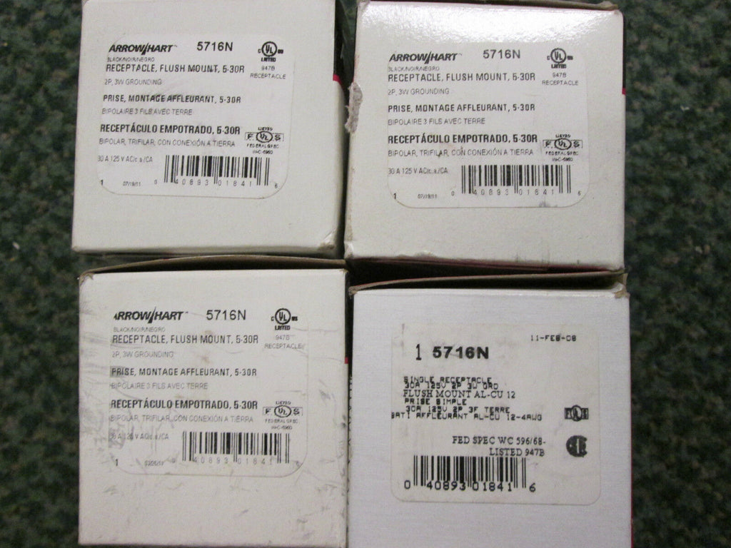 Arrow Hart AH5716N Single Receptacles 30A 125V *New In Box, Set Of 4*