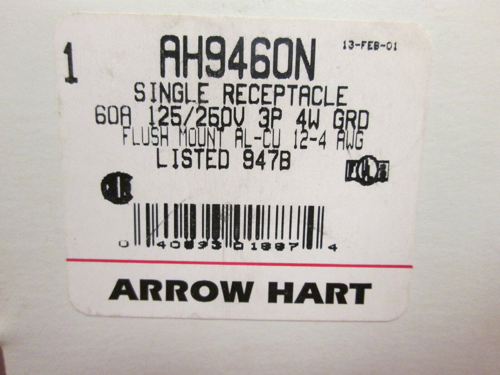 Arrow Hart AH9460N 60A 125/250V 4W New Surplus_x000D_ Condition: New – Open boxBrand: Arrow HartModel: ReceptacleMPN: AH9460N Arrow Hart AH9460N 60A 125/250V 4W New Surplus Arrow Hart ReceptacleModel: AH946060A125/250V location: 2K2-35 Arrow Hart Receptacle Model: AH9460 60A 125/250V location: 2K2-35