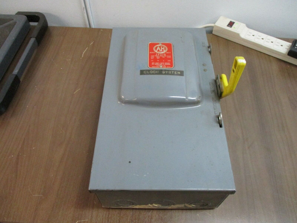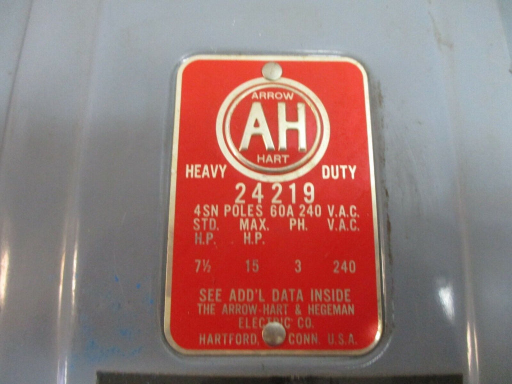 Arrow Hart Fusible Safety Switch / Disconnect 24219 60A 240V 3P Used_x000D_ Condition: UsedCurrent Rating: 51-60 AMaximum Amperage: 60 AMPN: 24219Brand: Arrow Hart Arrow Hart Fusible Safety Switch / Disconnect 24219 60A 240V 3P Used Arrow Hart Fusible Safety Switch / Disconnect Part#: 24219 60A 240V 3P Used loc: 14B4-36 Arrow Hart Fusible Safety Switch / Disconnect Part#: 24219 60A 240V 3P Uséd loc: 14B4-36