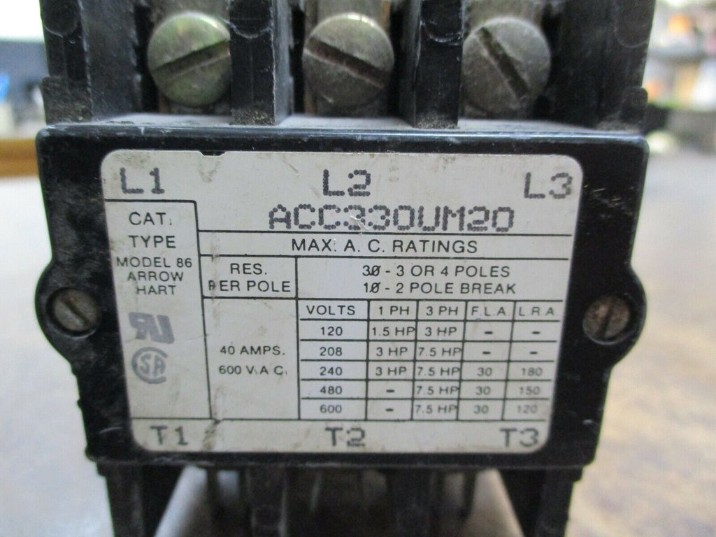 Arrow Hart Model 86 Contactor ACC330UM20 110-120V Coil 40A 600V Used