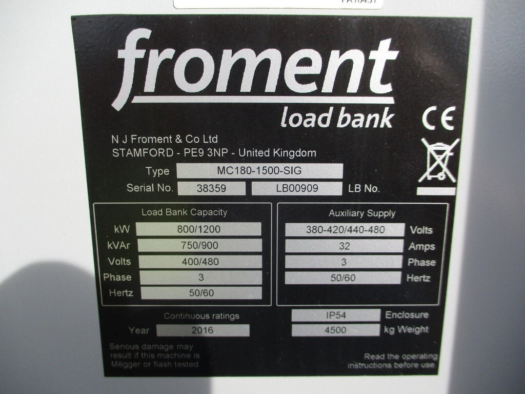 ASCO 6000 Series Froment Load Bank Part #: MC180-1500-SIG 800/1200 KW 750/900 kVAR 400/480 V3Ph 50/60 Hz IP54 Enclosure MFD: 2016 Weight: 4500kg UsedLoc: AB11-7088- Part #: MC180-1500-SIG
