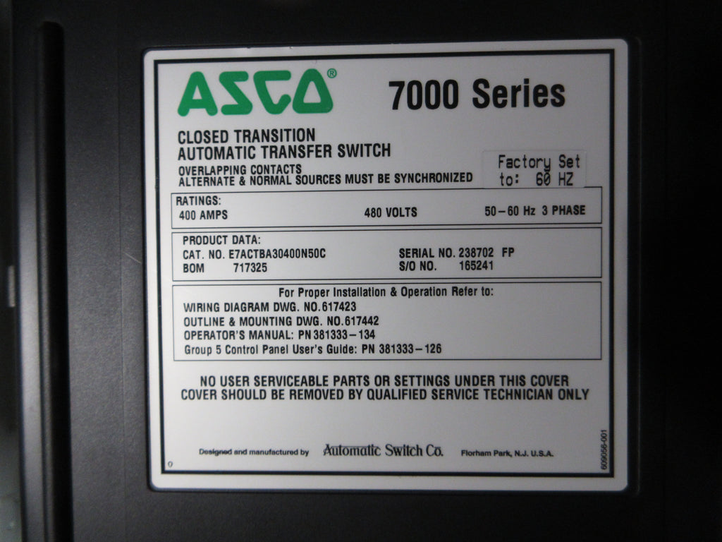 Asco 7000 Series Automatic Transfer Switch w/ Bypass Part #: E7ACTBA30400N50C 400 A 480 V 60 Hz 3Ph *(1) Cover Screw* Dims: 75" x 30" x 28" Weighs: 500 LBS Used Loc: AB11-9221