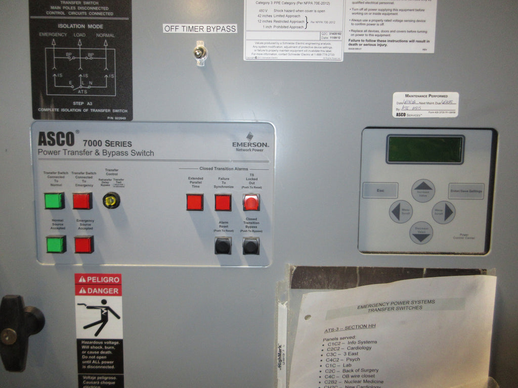 Asco 7000 Series Automatic Transfer Switch w/ Bypass Part #: H7ACTBB30800N50C 800 A 480 V 3Ph 60 Hz 4W *Broken Transfer Control Switch* Dims: 58" x 39" x 97" Weighs: 1,700 LBS Used Loc: AB11-9218