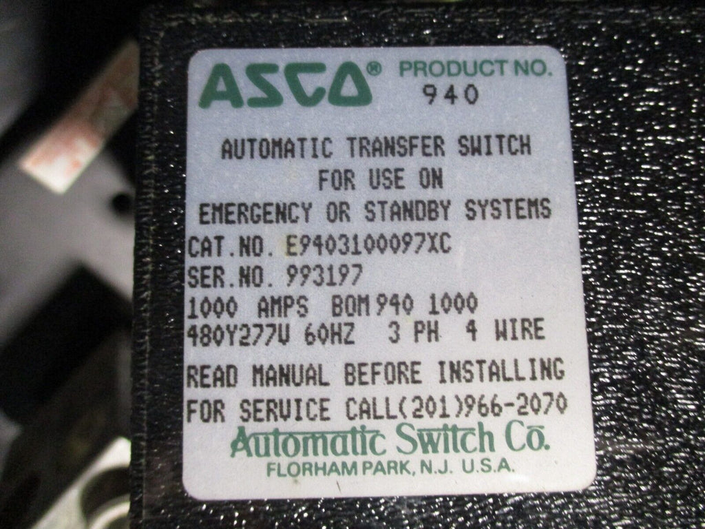 Asco 940 Series Automatic Transfer Switch E9403100097XC 1000A 480Y/277V 60Hz 3Ph