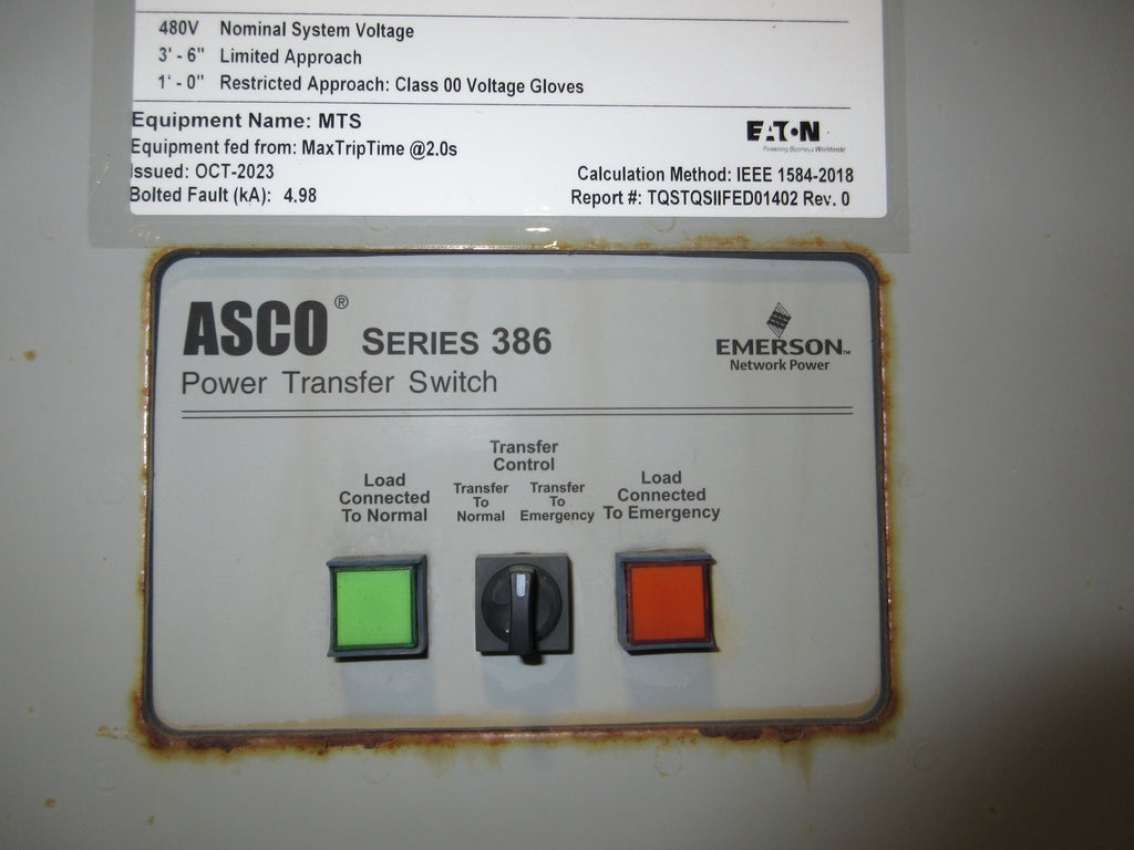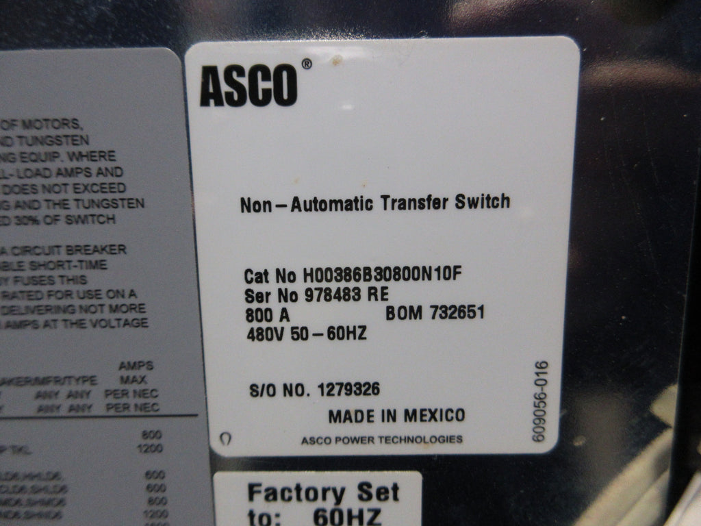 Asco Non-Automatic Transfer Switch H00386B30800N10F 800A 480V 3Ph Used