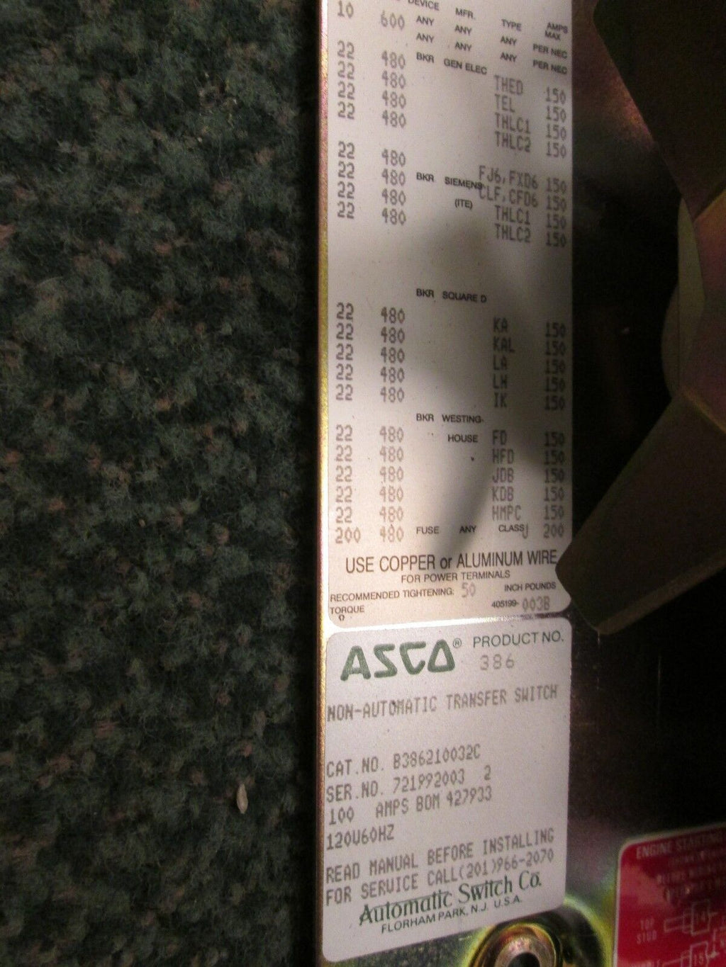 ASCO Non-Automatic Transfer Switch w/ Controller B386210032C 100A 120V 60Hz Used_x000D_ Condition: UsedBrand: ASCOModel: Non-Automatic Transfer SwitchMPN: B386210032C ASCO Non-Automatic Transfer Switch w/ Controller B386210032C 100A 120V 60Hz Used ASCO Non-Automatic Transfer Switch w/ Controller B386210032C 100A 120V 60Hz UsedLOC# 1N4-6 ASCO Non-Automatic Transfer Switch w/ Controller B386210032C 100A 120V 60Hz Uséd LOC# 1N4-6