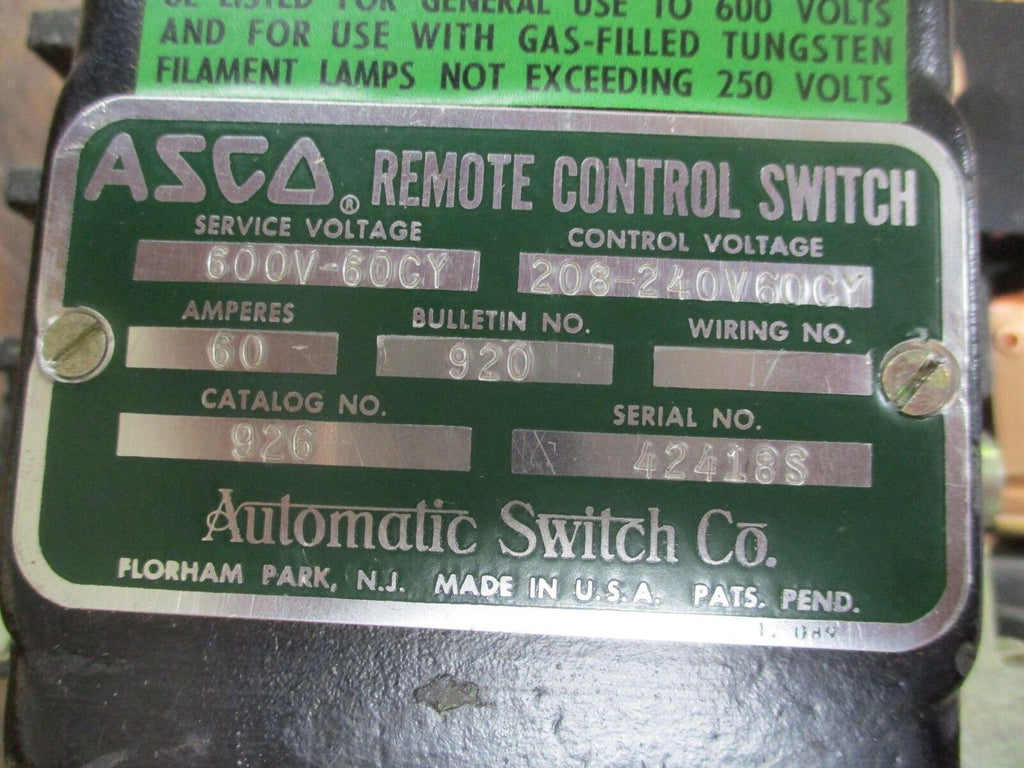 ASCO Remote Control Switch 926 60A 600V 60Hz Control: 208-240V...