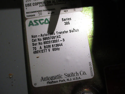 Asco Series 386 Non-Automatic Transfer Switch 38637091XC 70A 480Y/277V 60Hz 3Ph