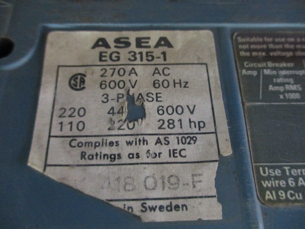 Asea Size 5 Contactor Part #: EG 315-1 270 A 600 V 110-120 V Coil Used Loc: AB11-5404 / AB6D2- Part #: EG 315-1