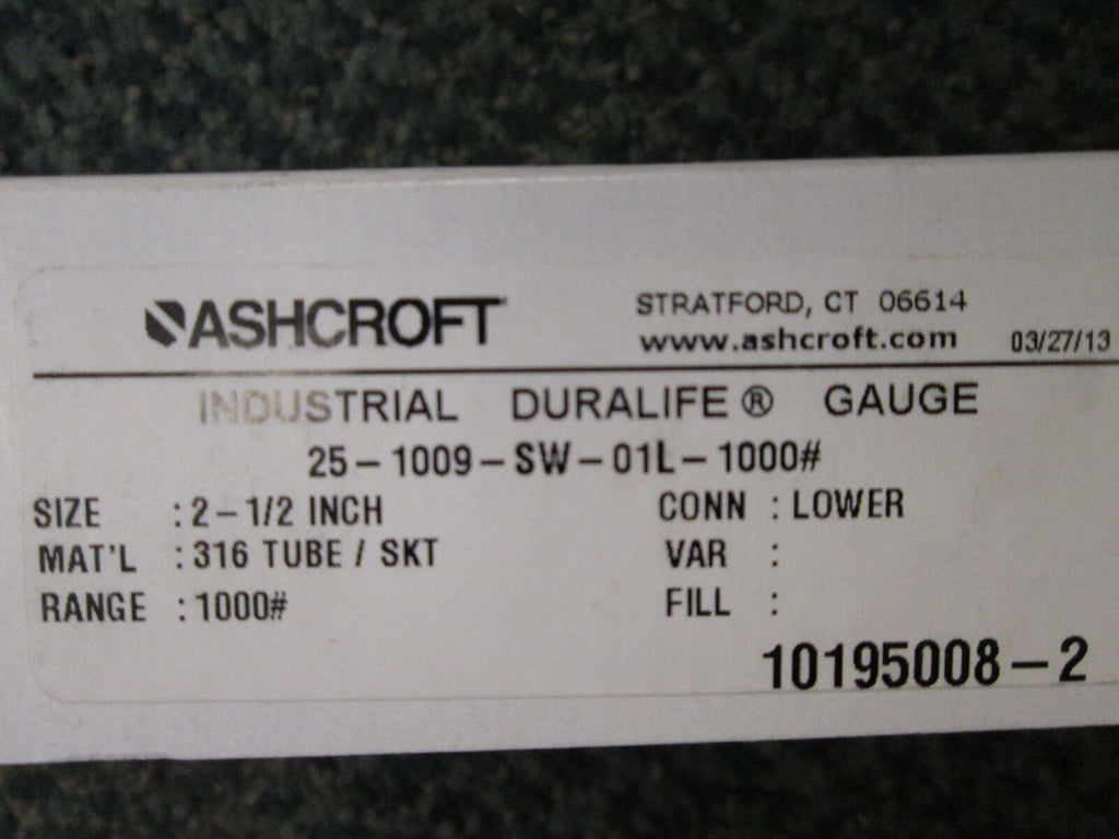 Ashcroft Industrial Duralife Gauge 25-1009-SW-01L-1000# Condit...
