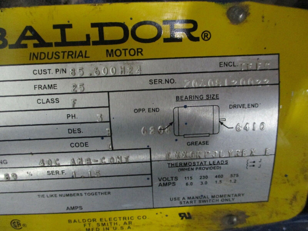 Baldor AC Motor 09S019X764G1 15HP 3600RPM FR:25 230/460V 34.4/17.2A 3Ph Used_x000D_ Condition: UsedEnclosure Type: TEFC (Totally Enclosed Fan Cooled)AC Frequency Rating: 60 HzCurrent Type: ACAC Phase: Three PhaseMPN: 09S019X764G1Shaft Diameter: 1 5/8 inRated Load (HP): 15 HPBrand: BaldorNominal Rated Input Voltage: 460 VService Factor: 1.15Base RPM: 3510 Baldor AC Motor 09S019X764G1 15HP 3600RPM FR:25 230/460V 34.4/17.2A 3Ph Used Baldor AC Motor Part #: 09S019X764G1 15HP 3510RPM Frame: 25 Enclosure: TEFC230/460V 34.4/17.2A 3Ph 60HzUsed*Missing Terminal Box*Weight: 244 lbsLOC AB11-1643 Baldor AC Motor Part #: 09S019X764G1 15HP 3510RPM Frame: 25 Enclosure: TEFC 230/460V 34.4/17.2A 3Ph 60Hz Uséd *Missing Terminal Box* Weight: 244 lbs LOC AB11-1643