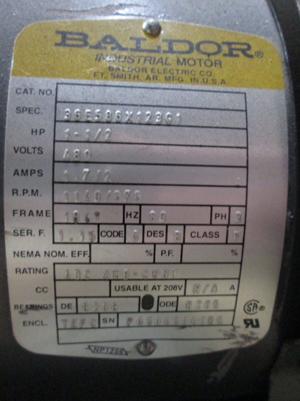 Baldor AC Motor 36E586X123G1 1/0.5HP 480V 1.7/2A 1140/875RPM 184T Frame Used