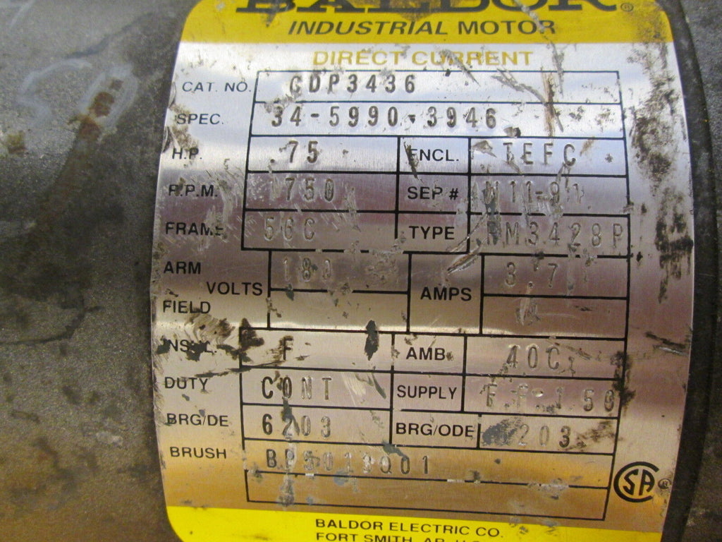 Baldor AC Motor CDP3436 .75HP 1800RPM FR:56C ENCL:TEFC 180V 3.7A Used Condition: UsedBrand: BaldorMPN: CDP3436 Baldor AC Motor CDP3436 .75HP 1800RPM FR:56C ENCL:TEFC 180V 3.7A Used Baldor DC Motor Part #: CDP3436 .75HP 1750RPM Frame: 56C Enclosure: TEFC 180V 3.7A *Missing (1) Terminal Cover Screw*UsedLOC AB7D2-20 Baldor DC Motor Part #: CDP3436 .75HP 1750RPM Frame: 56C Enclosure: TEFC 180V 3.7A *Missing (1) Terminal Cover Screw* Uséd LOC AB7D2-20