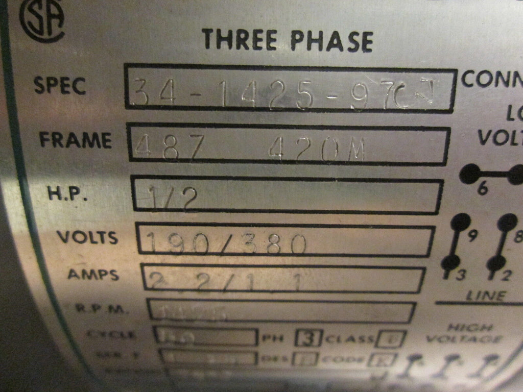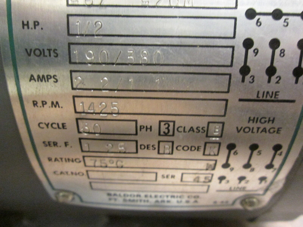 Baldor AC Motor ½HP 1425RPM FR: 48Z 190/380V 2.2/1.1A 3Ph Used...