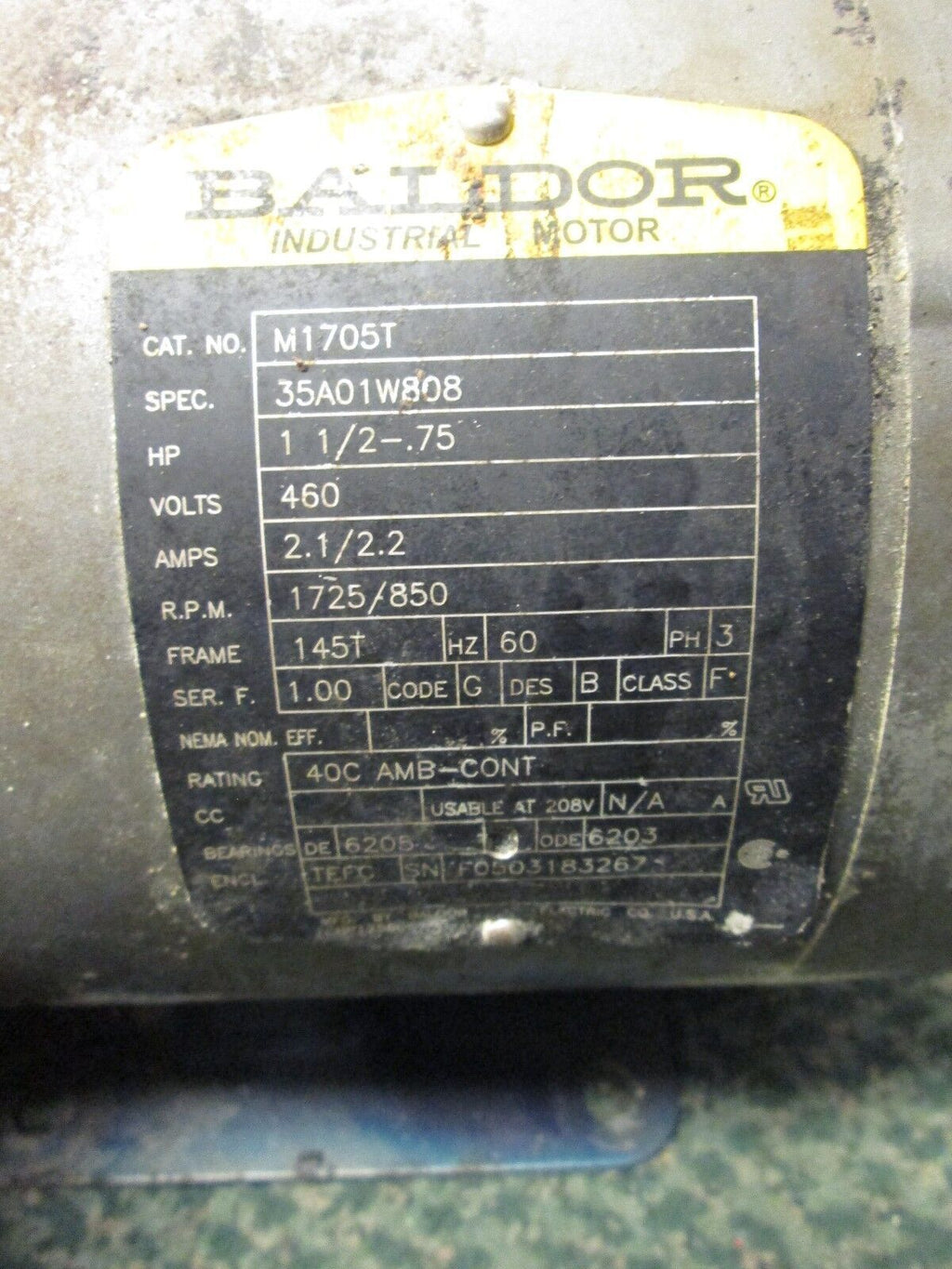 Baldor AC Motor M1705T 1.5-0.75HP 1725/850RPM 460V 2.1/2.2A 60...