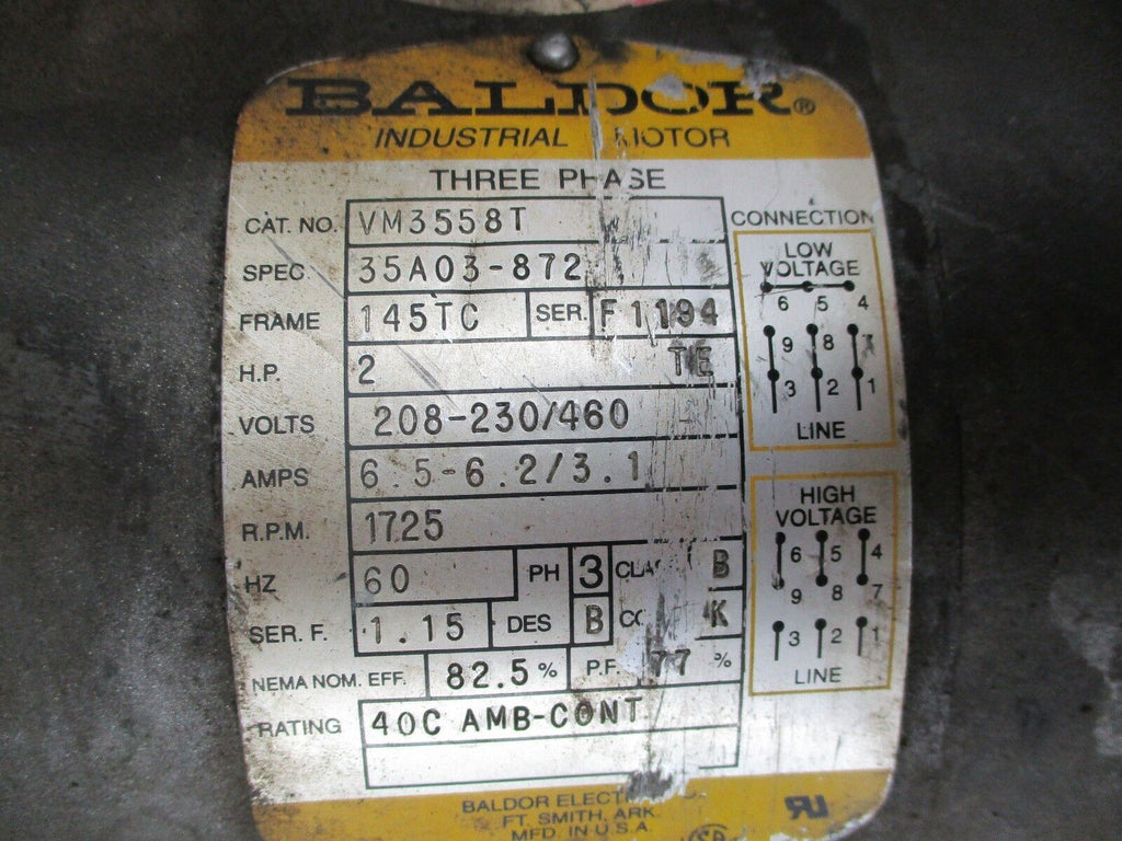 Baldor AC Motor w/ Gear VM3558T 2HP 1800RPM FR:145TC 208-230/460V 6.5-6.2/3.1A Condition: UsedMPN: VM3558TBrand: BaldorPower Source: AC Baldor AC Motor w/ Gear VM3558T 2HP 1800RPM FR:145TC 208-230/460V 6.5-6.2/3.1A Baldor AC Motor w/ Gear Part #: VM3558T 2HP 1725RPM Frame: 145TC 208-230/460V 6.5-6.2/3.1AUsedLOC AB11-562 / AB13K3 Baldor AC Motor w/ Gear Part #: VM3558T 2HP 1725RPM Frame: 145TC 208-230/460V 6.5-6.2/3.1A Uséd LOC AB11-562 / AB13K3