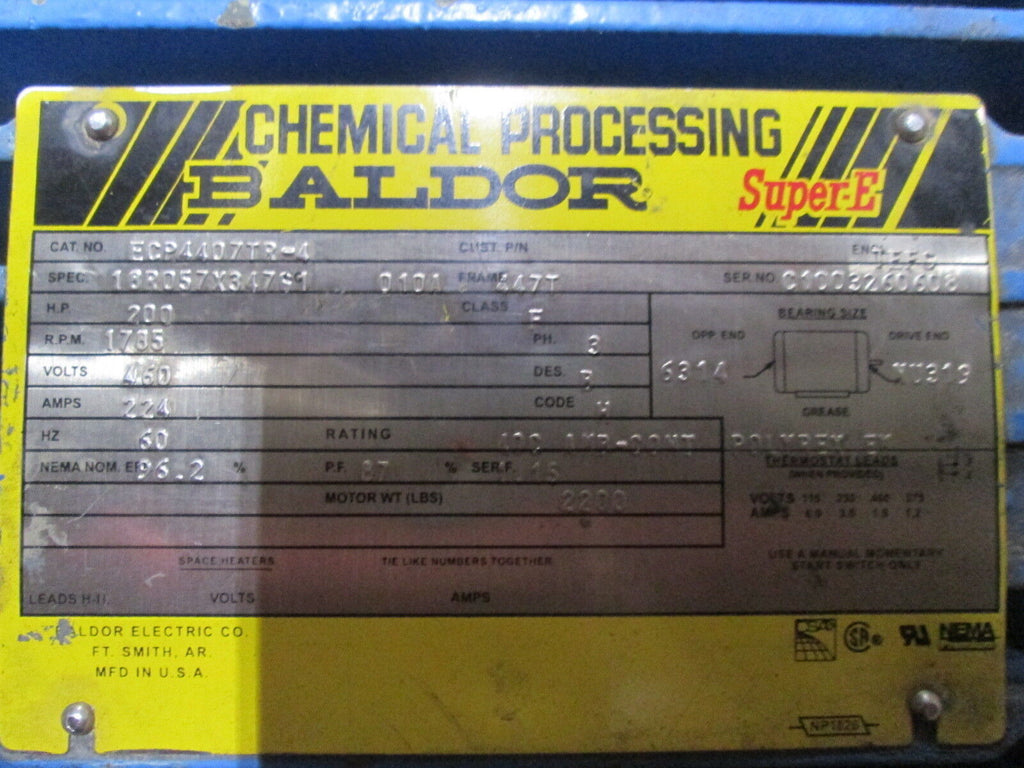 Baldor Chemical Processing/Severe Duty Super-E Motor Part #: ECP4407TR-4 200HP 1785RPM Frame: 447T 460V 224A Used Weight: 2200 lbs LOC AB11-494 / AB39A1