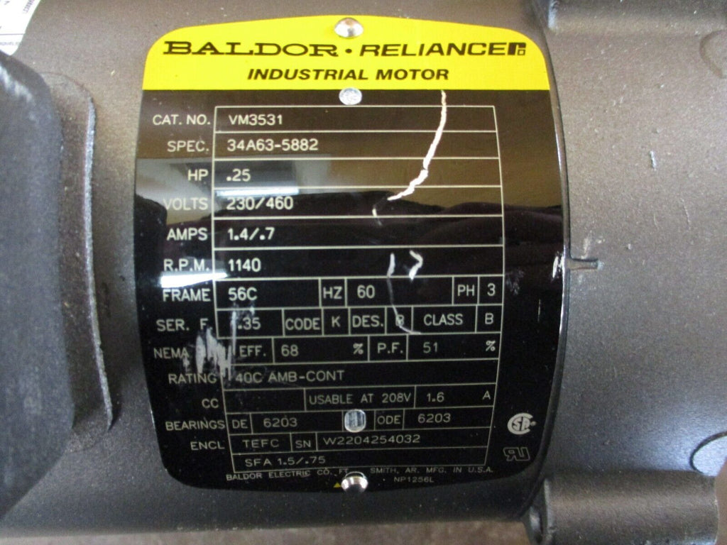 Baldor Motor VM3531 0.25HP 1200RPM 230/460V 1.4/0.7A 3Ph 60Hz ...