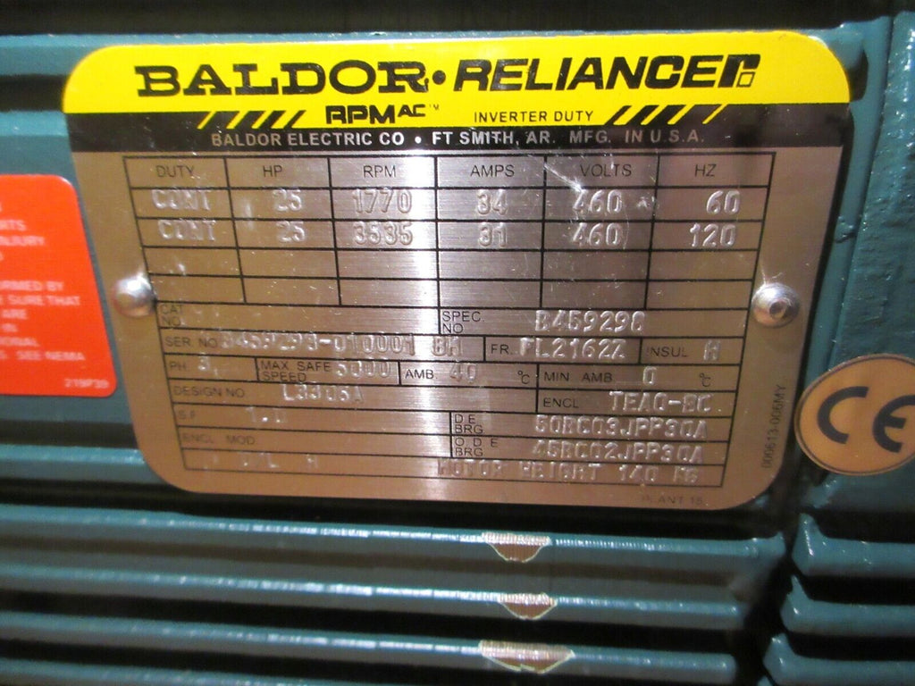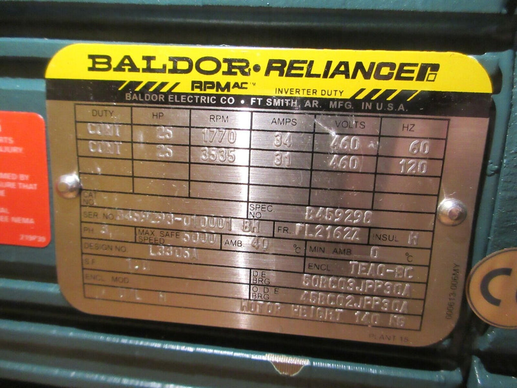 Baldor RPM AC Motor Part #: B459298 25 HP 1770 / 3535 RPM 460 V 60/120 Hz TEAO-BC Enclosure FL2162Z Frame Weight: 350 lbs. New Surplus LOC: AB11-0060 / AB29E6