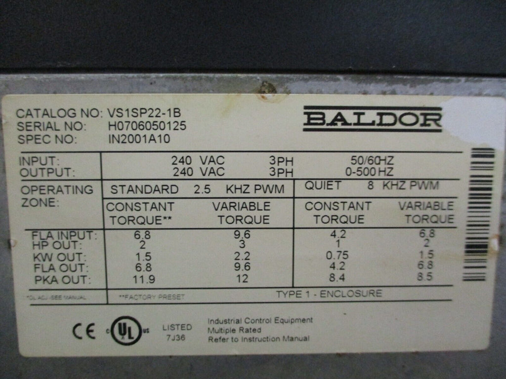 Baldor VS H2 AC Drive VS1SP22-1B 3HP 3Ph *No Keypad* Used_x000D_ Condition: UsedBrand: BaldorInput Voltage: 240 VMPN: VS1SP22-1BMaximum Load: 3 HPType: General Purpose AC Drive Baldor VS H2 AC Drive VS1SP22-1B 3HP 3Ph *No Keypad* Used Baldor VS H2 AC Drive Part #: VS1SP22-1B 3 HP 3Ph Input: 240 VAC50/60 Hz6.8 AOutput:240 VAC0-500 Hz6.8 A*No Keypad* Used Loc: AB11-5323 / AB13Q2 Baldor VS H2 AC Drive Part #: VS1SP22-1B 3 HP 3Ph Input: 240 VAC 50/60 Hz 6.8 A Output: 240 VAC 0-500 Hz 6.8 A *No Keypad* Uséd Loc: AB11-5323 / AB13Q2