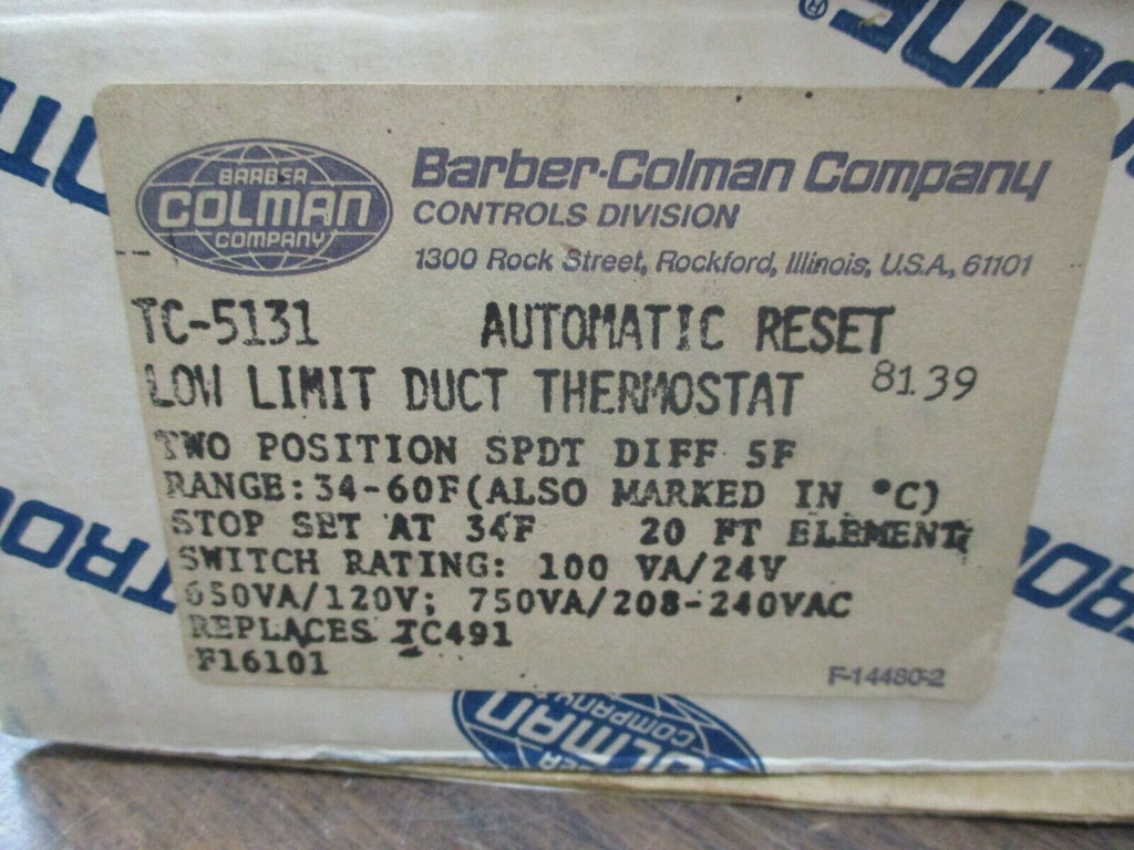 Barber-Colman Low Limit Duct Thermostat TC-5131 Range: 34-60°F New Surplus Condition: New – Open boxMPN: TC-5131Brand: Barber Colman Barber-Colman Low Limit Duct Thermostat TC-5131 Range: 34-60°F New Surplus Barber-Colman Low Limit Duct Thermostat Part #: TC-5131 Range: 34-60°FAutomatic ResetTwo-PositionNew SurplusLOC 22F3-63 Barber-Colman Low Limit Duct Thermostat Part #: TC-5131 Range: 34-60°F Automatic Reset Two-Position New Surplus LOC 22F3-63