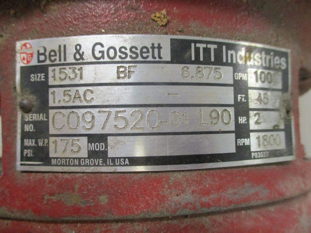 Bell & Gosset Pump 1531 BF 6.875 1.5AC 2HP 1800RPM 100GPM 45 Ft Head Used_x000D_ Condition: UsedBrand: Bell & GossettRated Power: 2 hpMPN: 1531 BF 6.875 1.5AC Bell & Gosset Pump 1531 BF 6.875 1.5AC 2HP 1800RPM 100GPM 45 Ft Head Used Bell & Gossett PumpPart #: 1531 BF 6.875 1.5AC2HP1800 RPM100 GPM45FT HeadUsedLoc: AB11-6521 / AB5C2 Bell & Gossett Pump Part #: 1531 BF 6.875 1.5AC 2HP 1800 RPM 100 GPM 45FT Head Uséd Loc: AB11-6521 / AB5C2