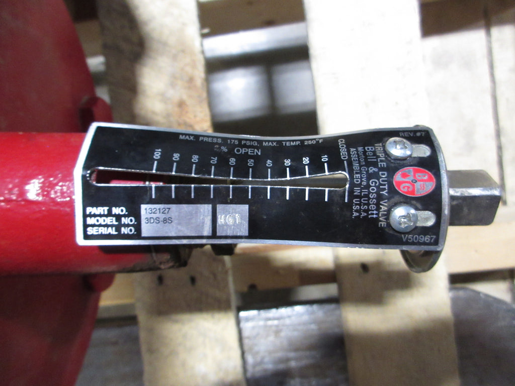 Bell & Gossett 3DS-8S Triple Duty Valve Part #: 132127 Size: 8" Cast Iron 175 PSI WOG Dims: 34" x 26" x 16" Weighs: 350 LBS Used Loc: AB11-9224 / AB31D5 / AB31D4