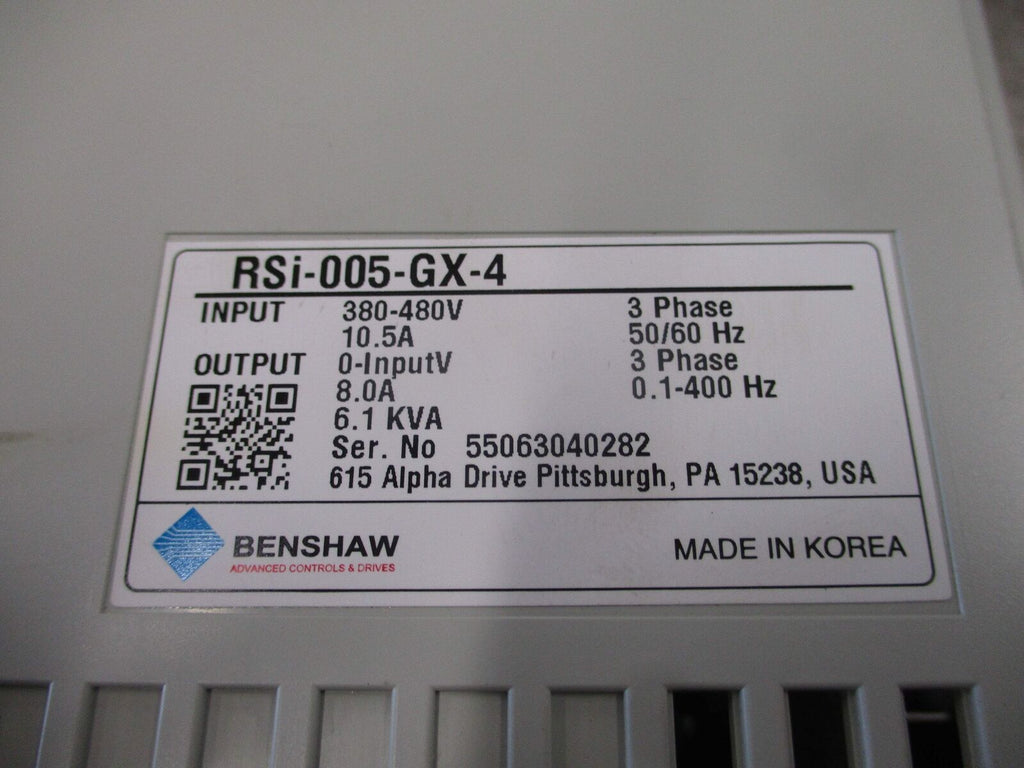 Benshaw AC Drive RSi-005-GX-4 5HP 3Ph Input: 380-480V / 3PH / 10.5A / 50/60Hz Output: 3PH / 8.0A / 0.1-400Hz / 6.1KVA Used_x000D_ Benshaw AC Drive RSi-005-GX-4 5HP 3Ph Input: 380-480V / 3PH / 10.5A / 50/60Hz Output: 3PH / 8.0A / 0.1-400Hz / 6.1KVA Used LOC 60C4-2