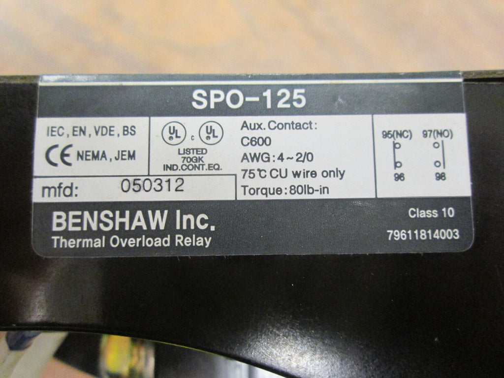 Benshaw Thermal Overload Relay SPO-125 Range: 85-125A Used