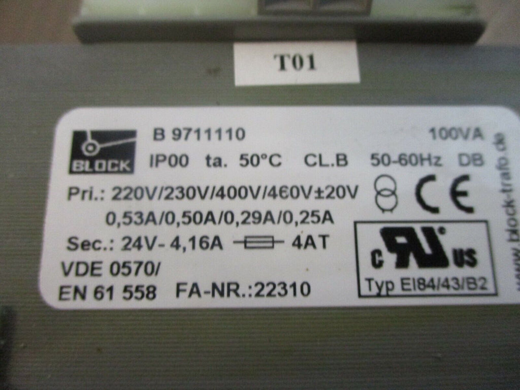 Block Transformer B 9711110 100VA Pri: 230/460V Sec: 24V 50-60Hz Used Condition: Used Power Rating: 100 VA Type: General Purpose Transformer Primary Voltage Rating (AC): 230/460 V MPN: B 9711110 Brand: BLOCK Secondary Voltage Rating (AC): 24 V Block Transformer B 9711110 100VA Pri: 230/460V Sec: 24V 50-60Hz Used Block Transformer Part #: B 9711110 100 VA Pri: 230/460 V Sec: 24 V 50-60 Hz Used Loc: 13E5-30 / AB11-3656//(AB3N4)/ CR2A1 Block Transformer Part #: B 9711110 100 VA Pri: 230/460 V Sec: 24 V 50-60 Hz Uséd Loc: 13E5-30 / AB11-3656//(AB3N4) / CR1A1 / CR2A1 / CR2A7 / CR4B1
