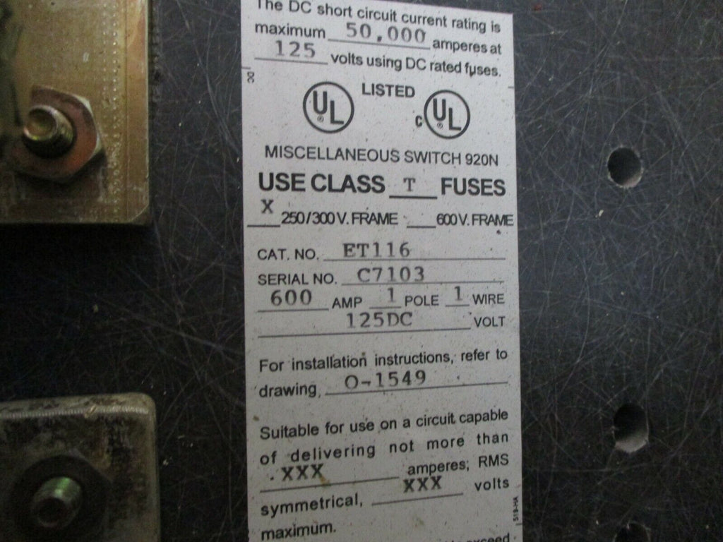 Boltswitch Bolted Pressure Contact Switch ET116 600A 125VDC 1P 1W Used
