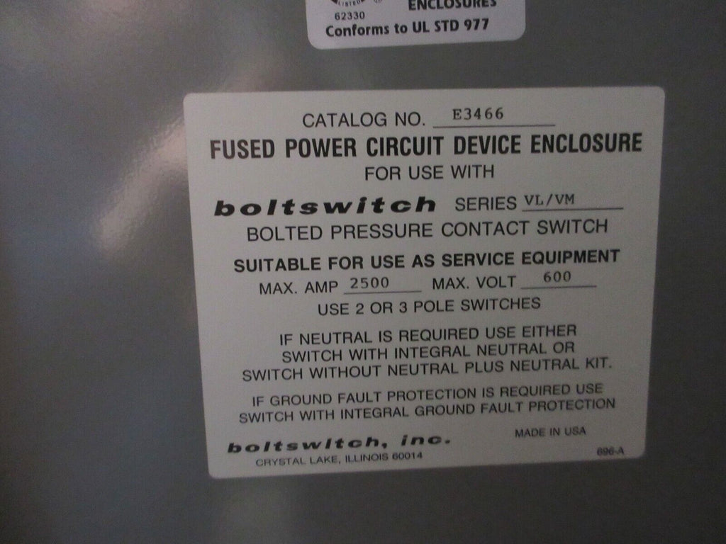 Boltswitch Bolted Pressure Contact Switch Part #: EVM3610-ST 2000A 600V 3P 3W Service RatedUsedWeight: 450 lbs.LOC AB11-0017- Boltswitch Bolted Pressure Contact Switch