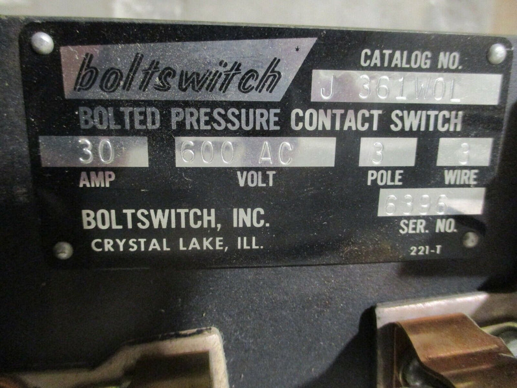 Boltswitch Bolted Pressure Contact Switch J 361WOL 30A 600V 3P 3W 30A Fuses Used