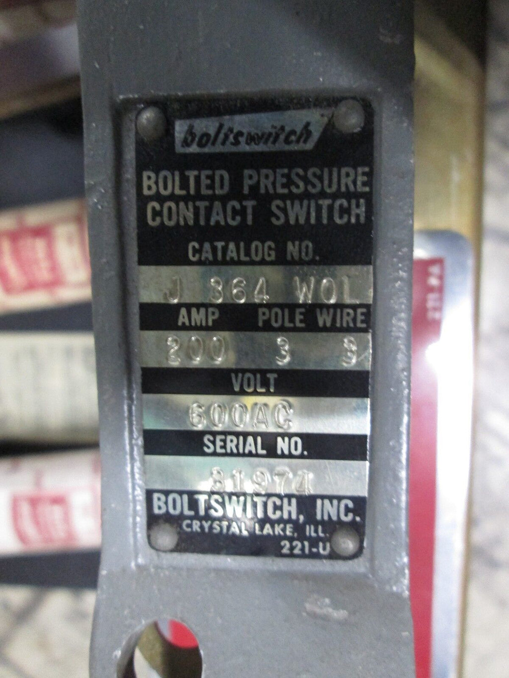 Boltswitch Bolted Pressure Contact Switch J 364 W0L 200A 3P 3W 600VAC Used