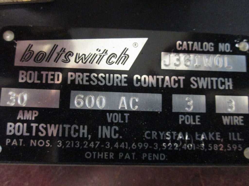 Boltswitch Bolted Pressure Contact Switch J361W0L 30A 600V 3P 3W w/ 20A Fuses