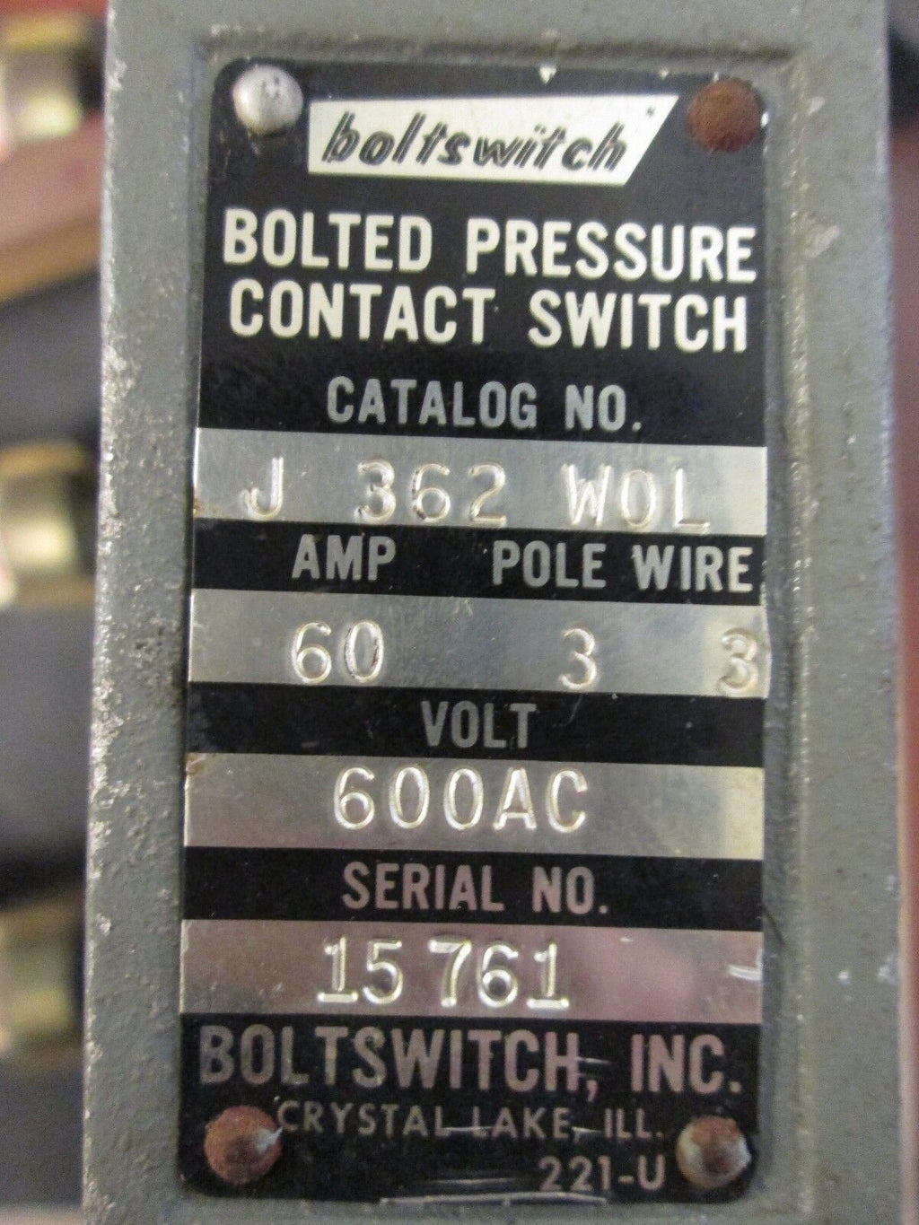 Boltswitch Bolted Pressure Contact Switch J362W0L 60A 600V 3P 3W w/ 45A Fuses
