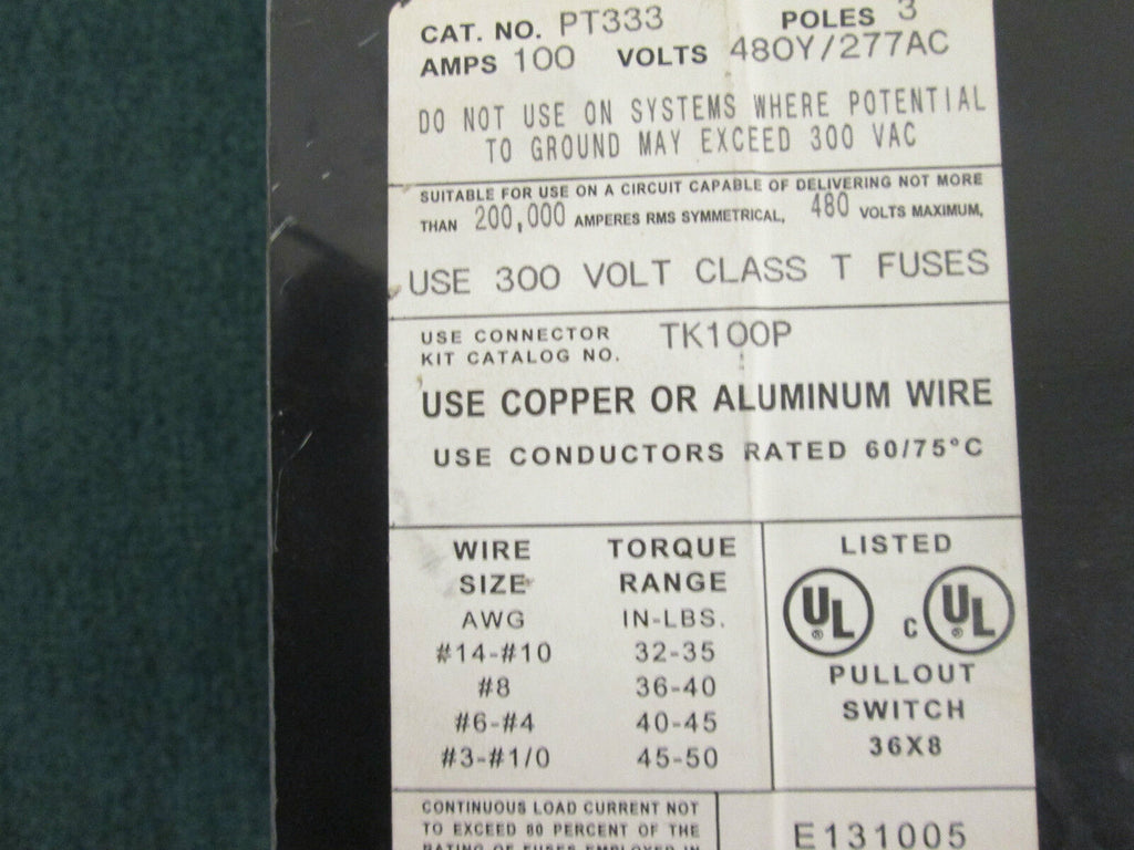 BOLTSWITCH CAT # PT333 100A 480Y/277AC PULLOUT 3P Used Conditi...