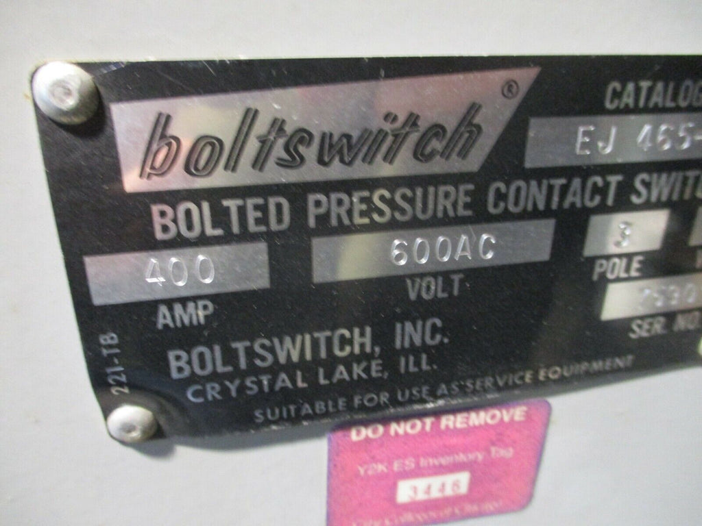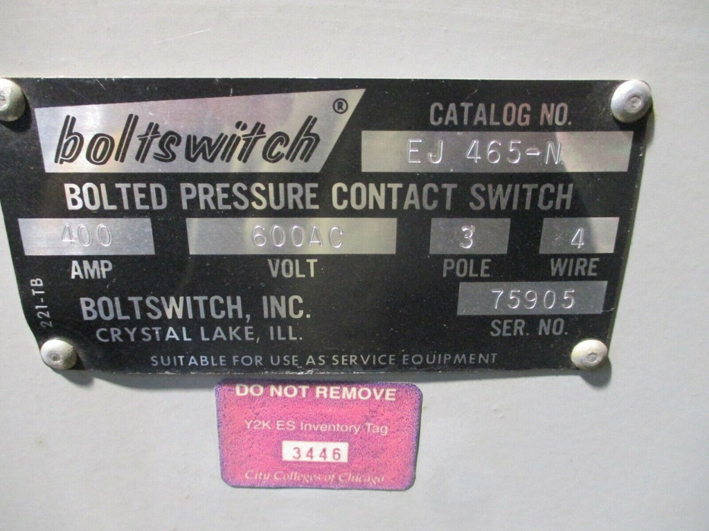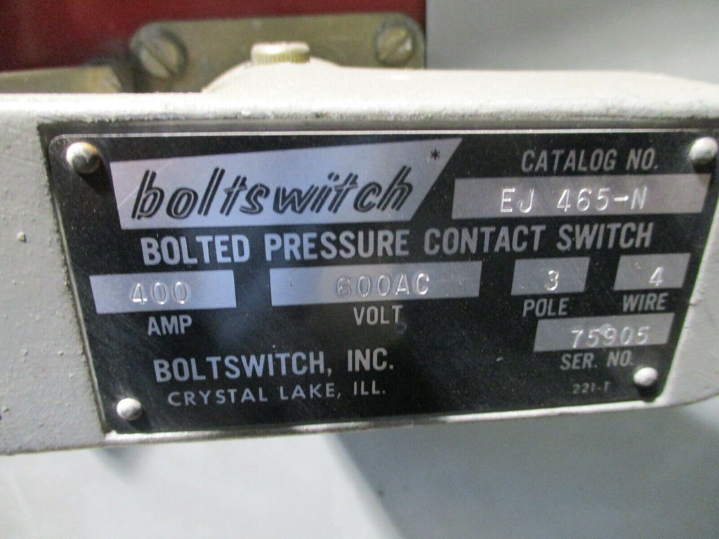 Boltswitch Enclosed Bolted Pressure Contact Switch EJ 465-N 400A 600V 3P 4W Used Condition: UsedBrand: BoltswitchOperation Method: On/OffCurrent Type: ACType: Bolted Pressure Contact SwitchMaximum Amperage: 400 AMPN: EJ 465-N Boltswitch Enclosed Bolted Pressure Contact Switch EJ 465-N 400A 600V 3P 4W Used Boltswitch Enclosed Bolted Pressure Contact Switch Part #: EJ 465-N 400A 600V 3P 4W Type 1 Enclosure Used LOC AB11-3140 / AB3P4 Boltswitch Enclosed Bolted Pressure Contact Switch Part #: EJ 465-N 400A 600V 3P 4W Type 1 Enclosure Uséd LOC AB11-3140 / AB3P4